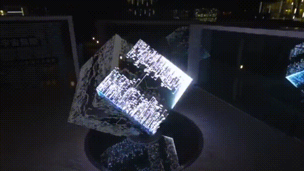 装置将天文数据与雕塑、建筑等艺术形式相结合,由形、光与空间3部分组成。现场会随机播放,20种数据动画,10种转变动画,每次切换都是数据结构的重新再造,营造一种宇宙千变万化的视觉冲击力。